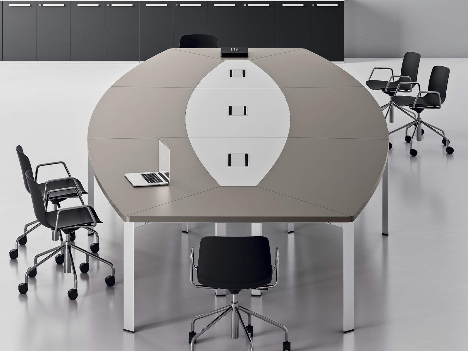La table de conférence Meet allie élégance et fonctionnalité. Conçue par le fabricant italien DVO, cette table se distingue par sa forme en tonneau unique, brisant la monotonie des modèles rectangulaires traditionnels. Avec sa capacité d'accueillir de nombreux collaborateurs, sa structure robuste en acier et ses options de personnalisation variées, la DV990 Meet répondra à tous vos besoins d'aménagement.