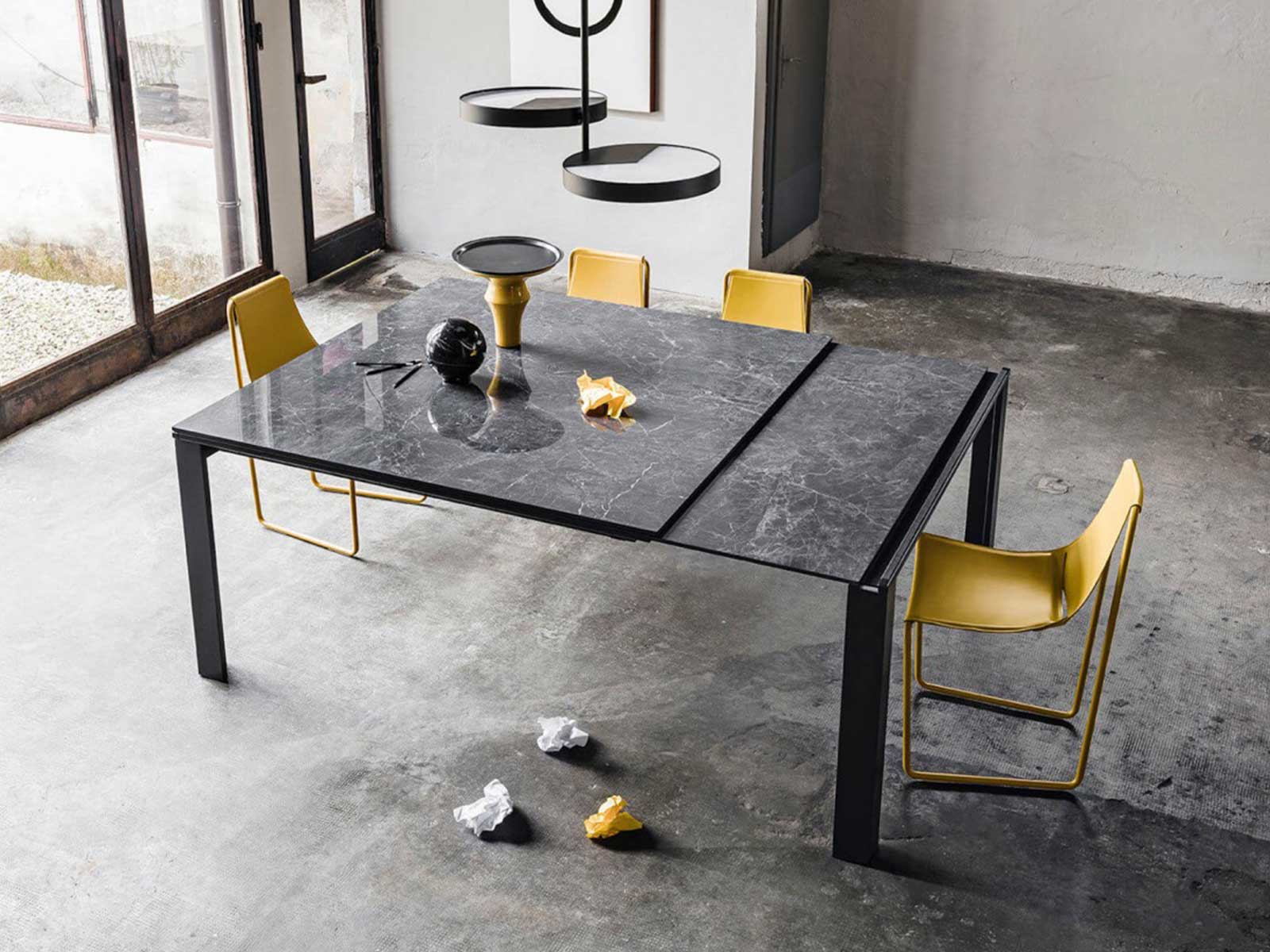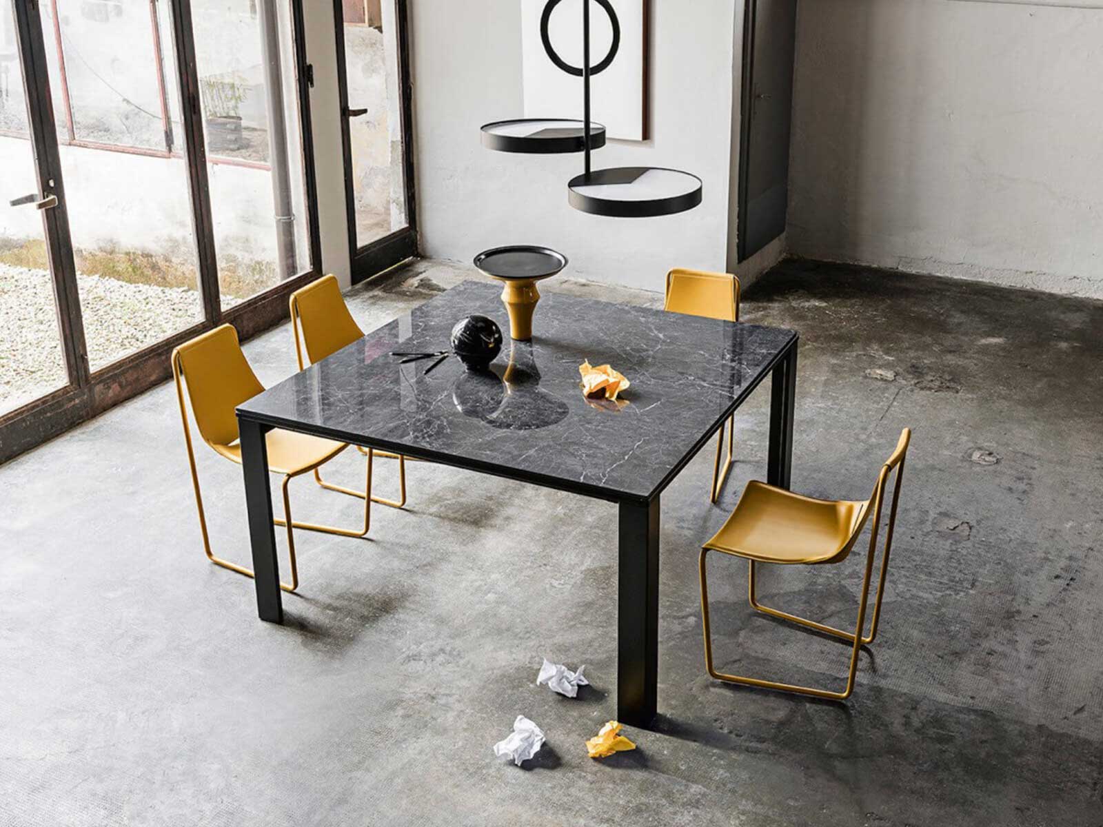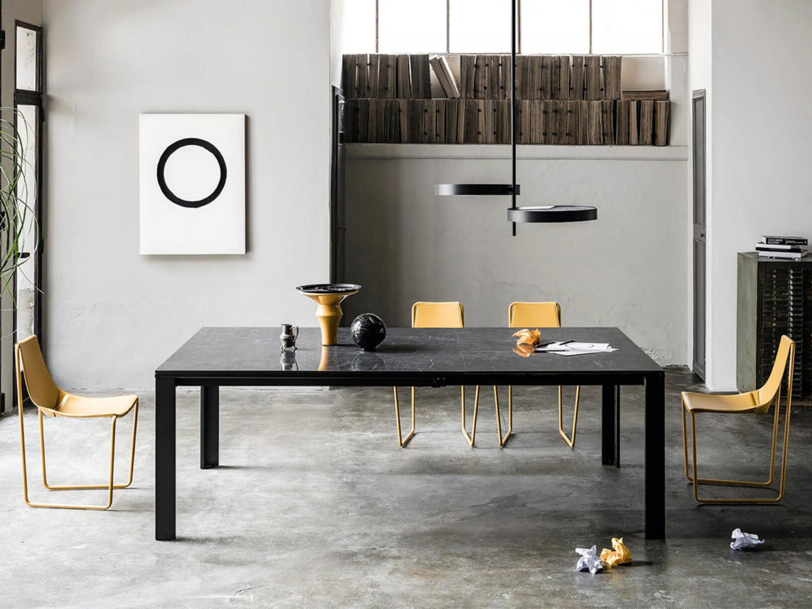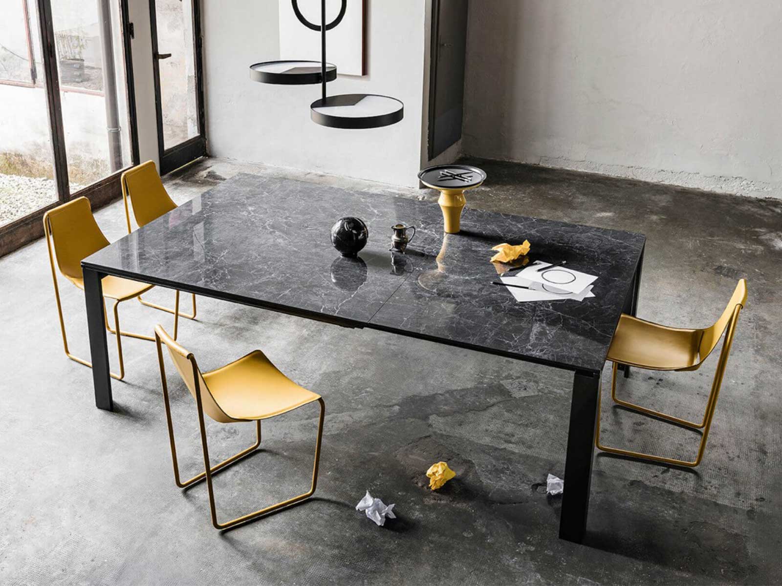 La table dispose d'un plateau en cristal-céramique donnant un effet de finition marbre à la table tout en étant beaucoup plus résistant et plus facilement nettoyable. La structure est en acier de finition noire (