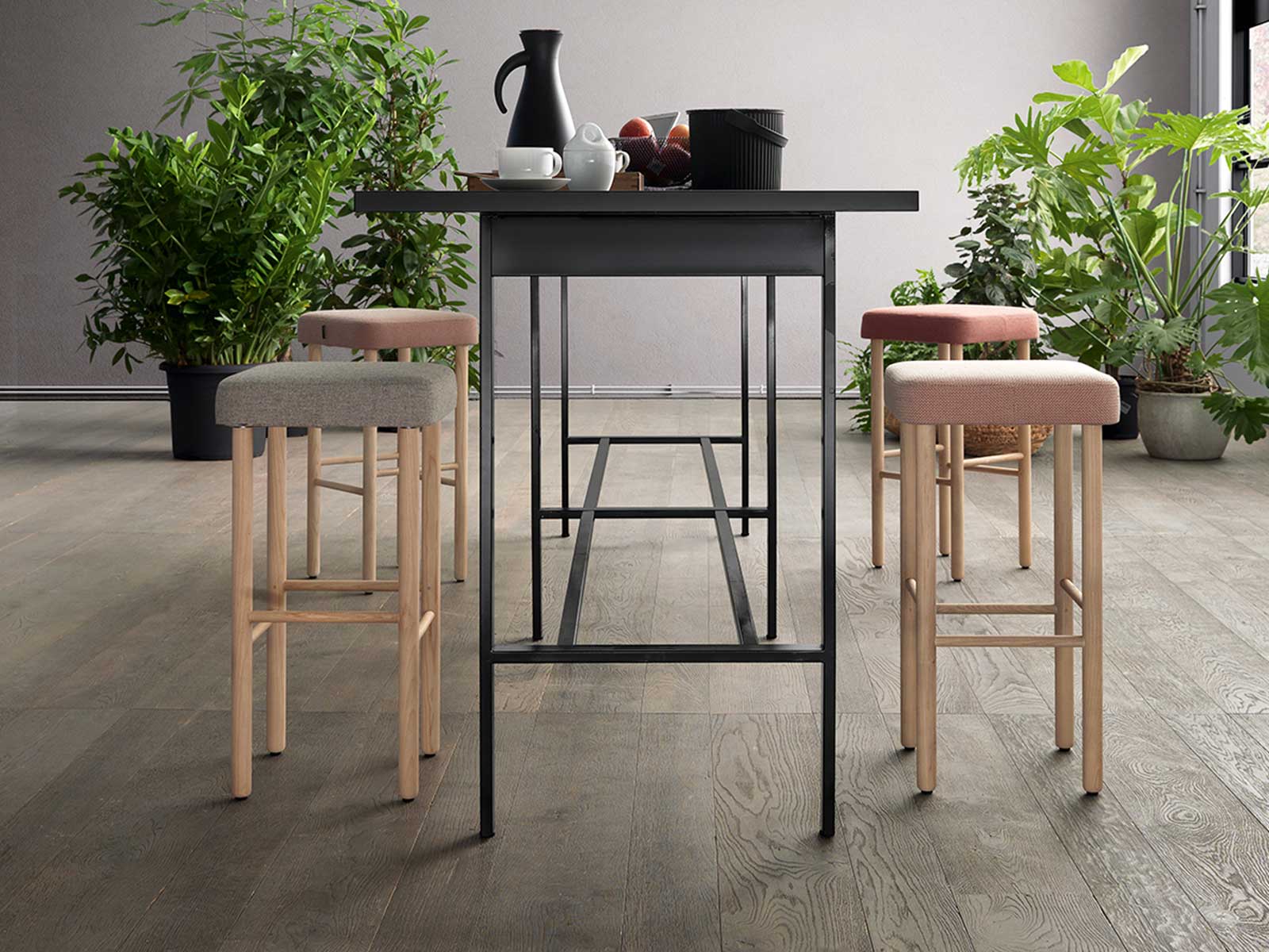 Le piètement de la table est en acier de section tubulaire rectangulaire 50x20 mm et proposée ici en noir. Il possède 4 traverses qui forment un repose-pieds accessible des 2 cotés de la table. Le piètement est en retrait, ce qui permet de placer une personne à chaque bout de la table.