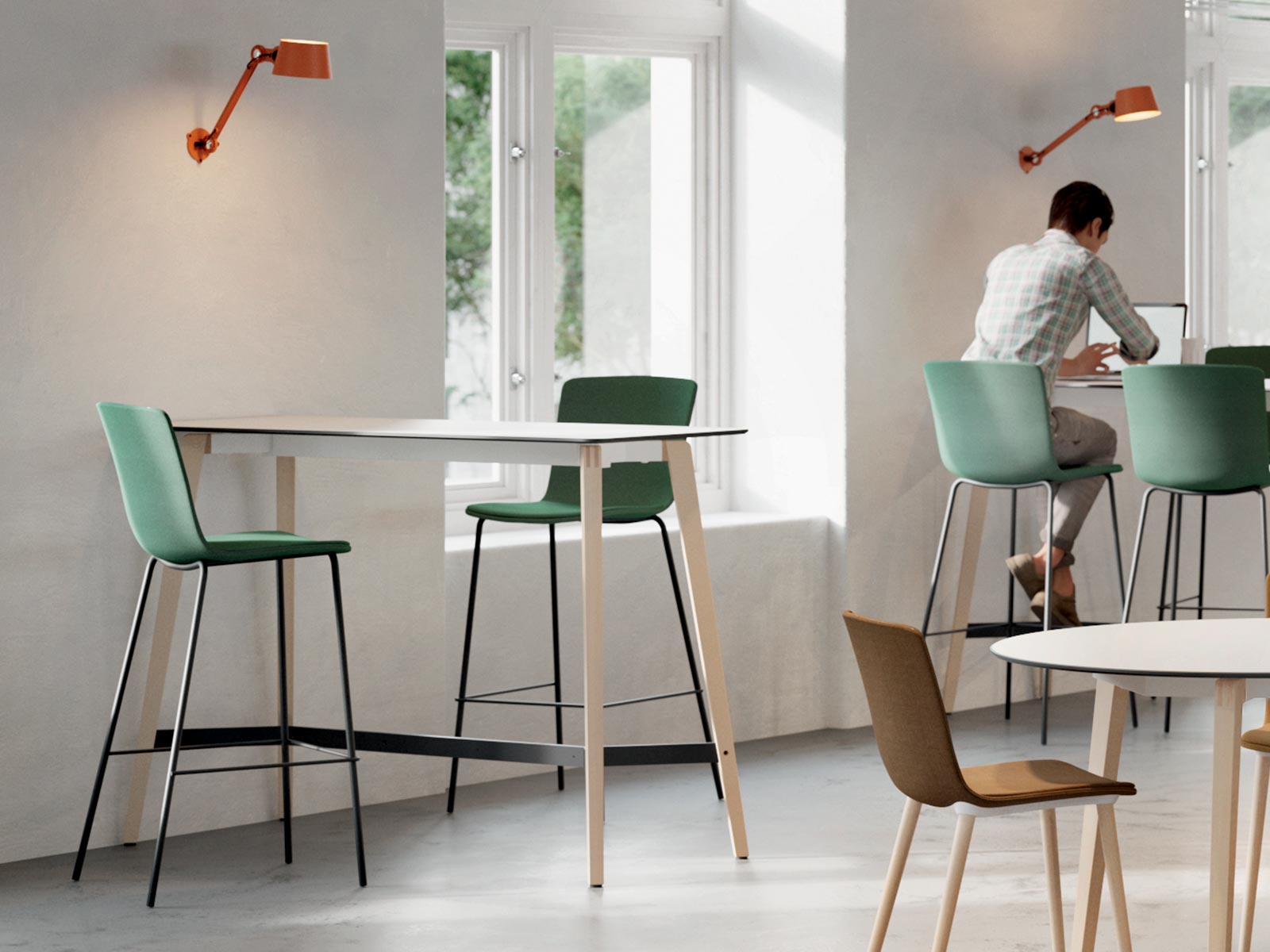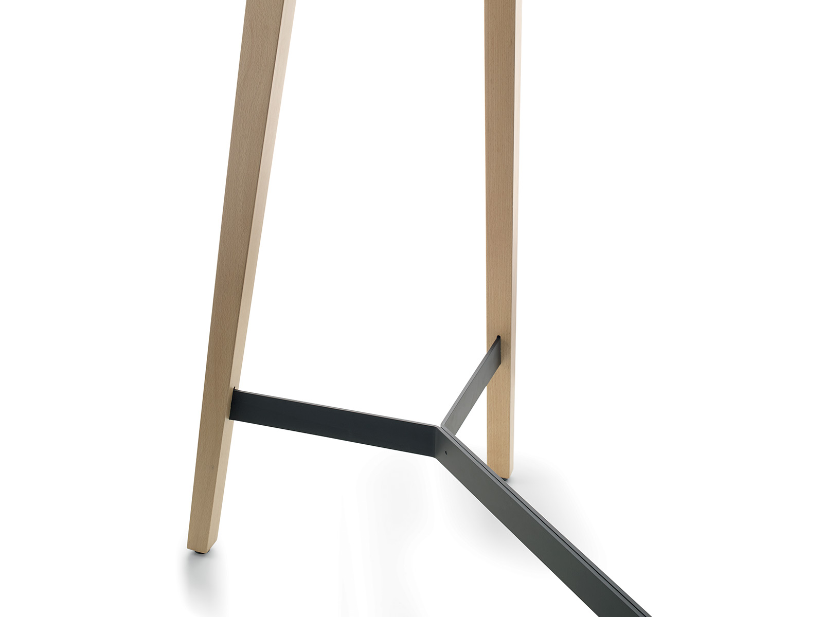 La table de haute Timber reprend l'élégant piètement en massif de hêtre de la collection et propose un espace de détente ou réunion en hauteur. De part son usage, le plateau est ici proposé en compact (MDF haute densité), plus résistant à l'usure, avec des coins arrondis. Un support pour les pieds en métal est également inclus pour plus de confort.