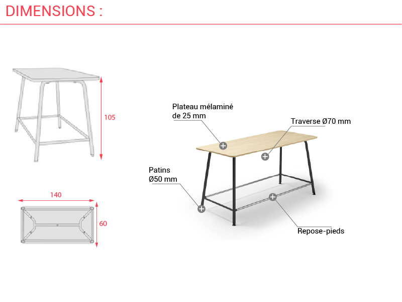 La table haute est également proposée avec une hauteur de plateau à 74 cm. Elle se décline aussi en version mobile avec des roulettes.