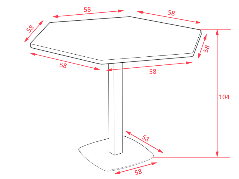 La table mesure 104 cm de hauteur et 58 cm sur ses 6 côtés.