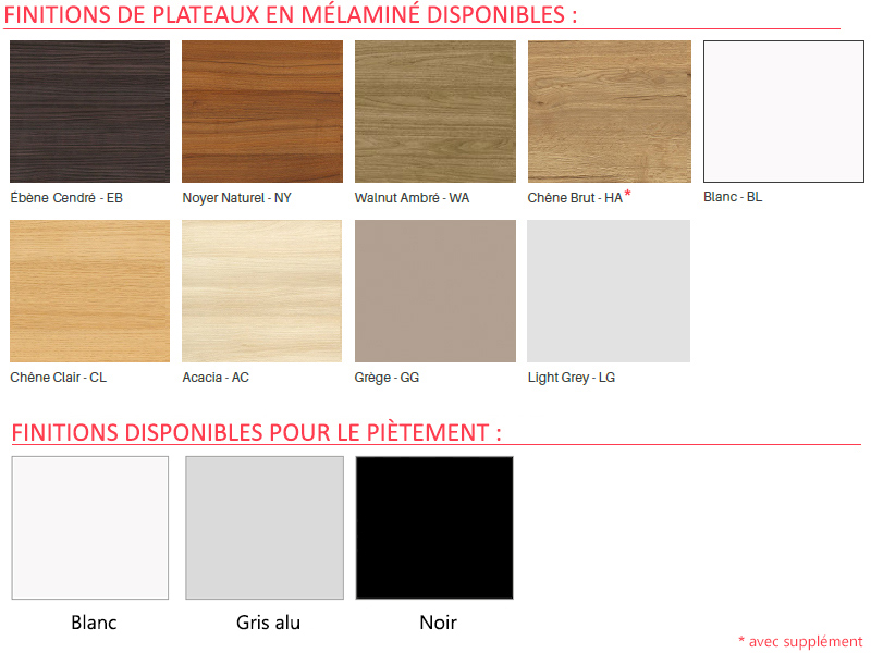 Le plateau est en mélaminé double face haute qualité. Il est antireflets et mesure 25 mm d'épaisseur. Les angles sont adoucis pour plus d'ergonomie. Le plateau est disponible en 7 finitions, voir le nuancier.
