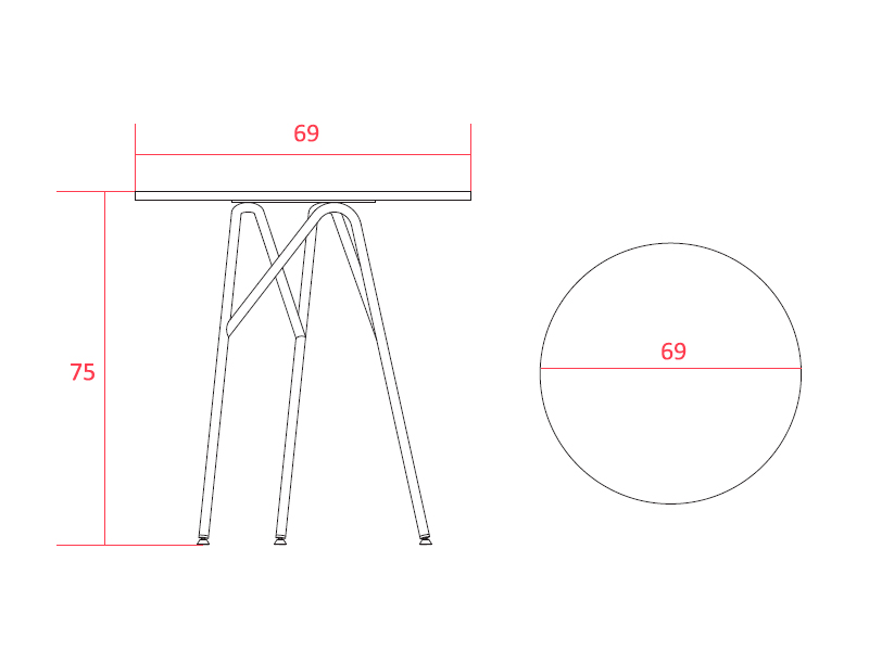 Cette table mesure 75 cm de hauteur et 69 cm de diamètre. Son plateau est disponible en HPL haute densité, très résistant aux chocs, d'épaisseur 10 mm avec chant noir (sur demande), ou en aggloméré avec revêtement en mélaminé d'épaisseur 18 mm. Il est traité anti-reflets, anti-rayures et est très facile à nettoyer. Il est disponible en 4 finitions :