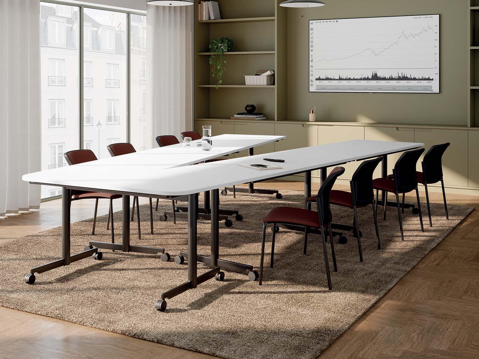 L’ensemble de tables Evolve, flexible et pratique, offre des plateaux rabattables, des piétements robustes sur roulettes et un système d’accroche intuitif.  Disponible en plusieurs formes et configurations, la table s’adapte aux espaces de travail modernes et dispose d’une garantie de 8 ans.