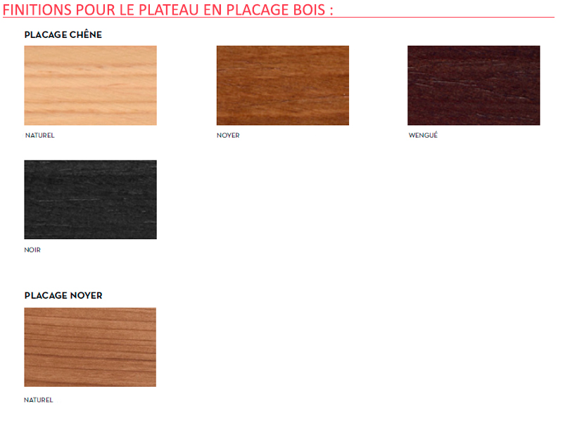 Différentes finitions de plateaux et coloris de piètement sur demande.