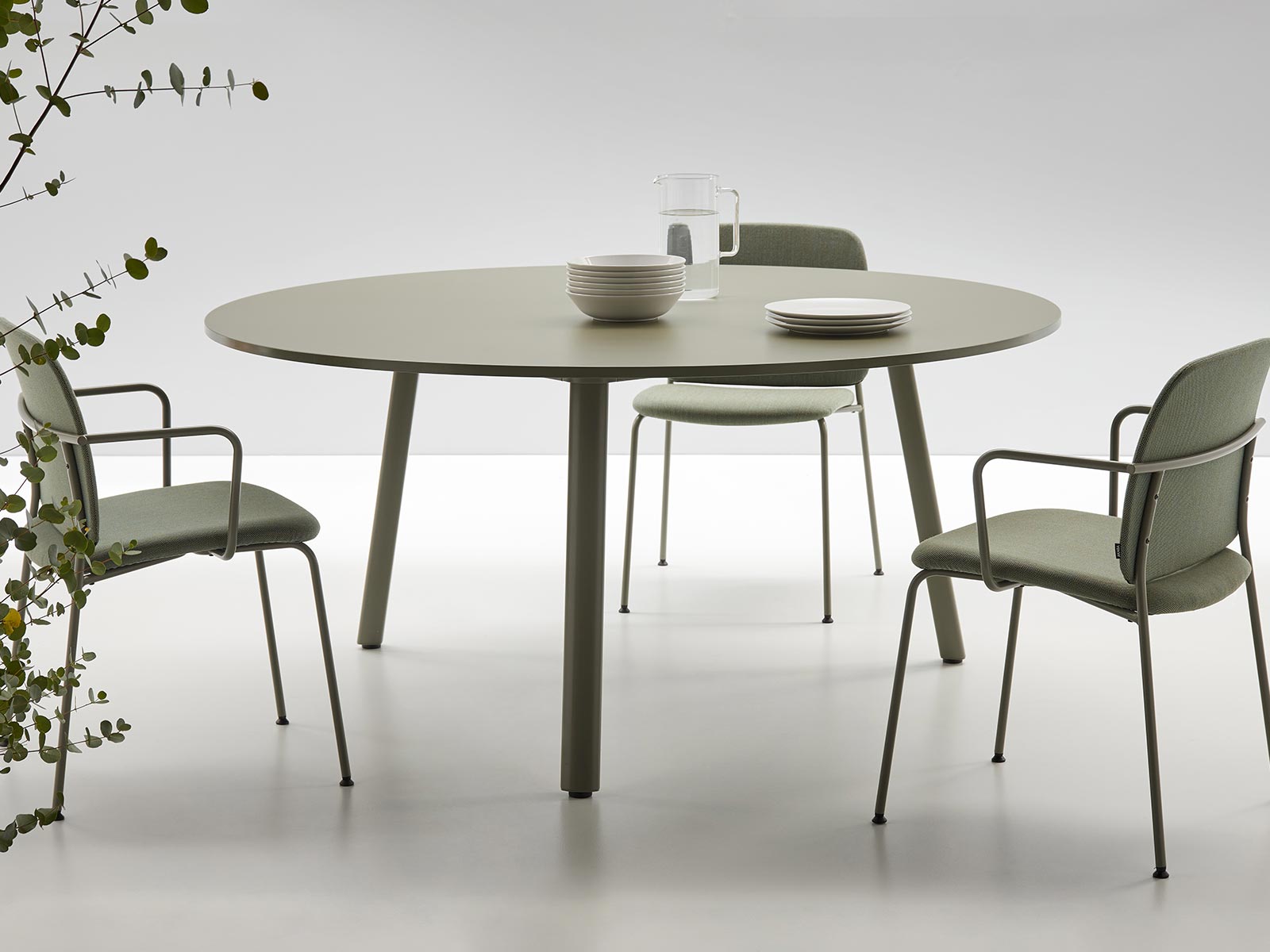 Cette table ronde moderne de la collection Tknika est disponible dans des coloris unis ou bois et dans 4 dimensions de 110 à 160 cm de diamètre. Les coloris unis pourront s'assortir avec les 3 pieds métalliques ainsi que la structure en acier. Il est également possible sur demande (et avec surcoût) d'avoir les pieds en bois de hêtre naturel.