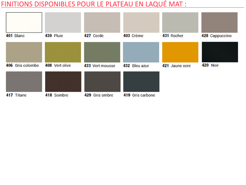 Le plateau existe en 6 finitions de mélaminé unies, 8 finitions bicolores (surcoût) et en 16 coloris laqués, sur demande et avec surcoût.
