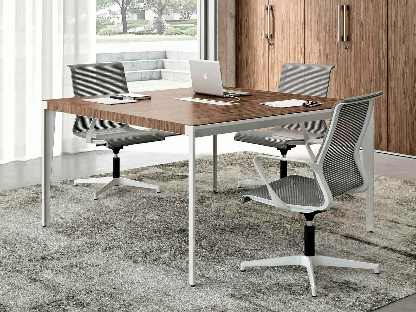 Le piètement en acier est au choix en gris ombre ou blanc opaque. La peinture mate à effet "soft touch" anti-marques et anti-rayures participe à la finition soignée de cette table de réunion.