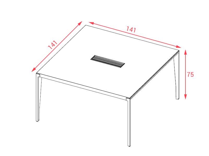 Le plateau de la table est en MDF avec placage bois et a une épaisseur de 18 mm. Sa particularité est qu'il a été travaillé avec une technique dite de pliage, qui a permis de créer un chant de 50 mm de hauteur sur les cotés longitudinaux, donnant ainsi à la table son aspect cossu et massif. Les arêtes sont arrondies pour plus d'esthétisme et de confort. Le plateau mesure 141 cm de largeur et de profondeur avec un top access central inclus.