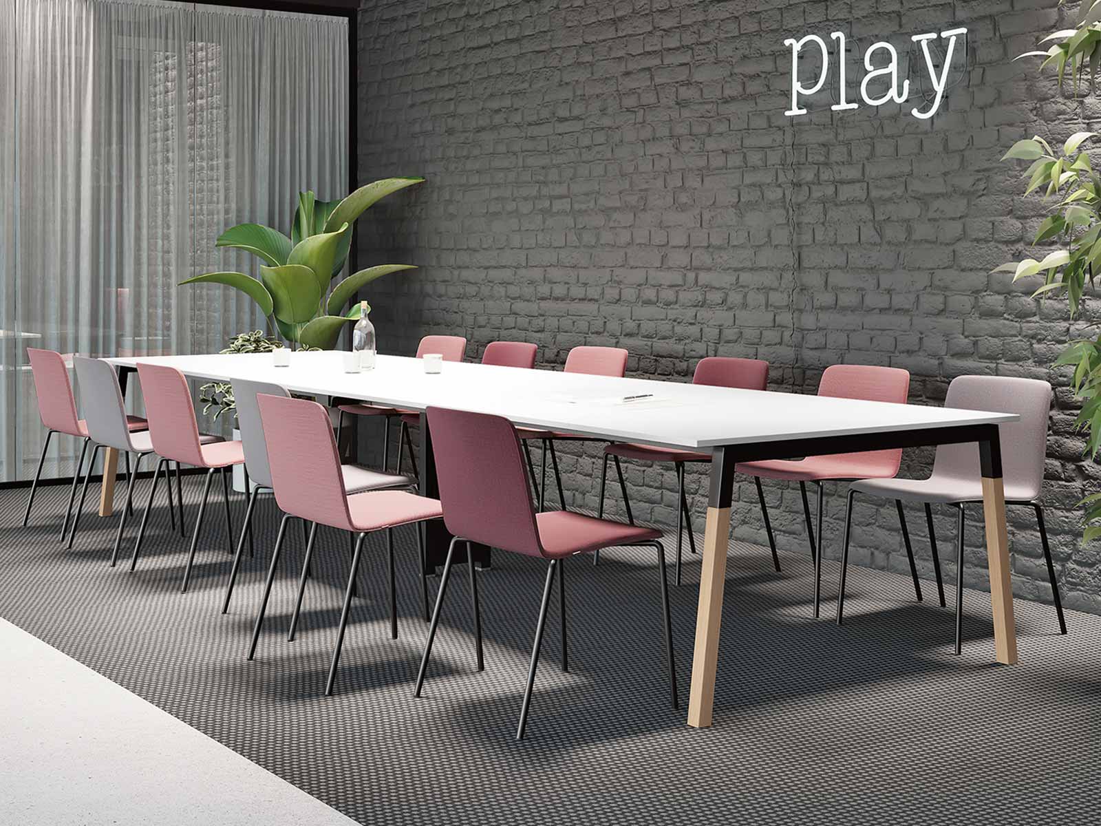 Cette grande table de réunion moderne est disponible en 5 dimensions et permettra d'accueillir de 8 à 12 personnes. Elle dispose d'une solide structure en acier, disponible en 2 coloris (blanc RAL 9010 ou noir RAL 9005), qui fusionne élégamment avec un piètement en frêne massif naturel.