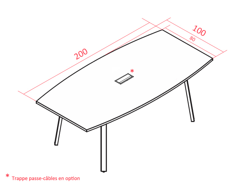 Le plateau en forme de tonneau est en bois mélaminé. Son épaisseur est de 28 mm et ses chants sont en PVC. MDD laisse le choix entre une largeur de 200 ou 240 cm et une profondeur de 80 ou 100 cm afin de s'adapter aux différents besoins des professionnels. Attention : il faut compter au minimum 1,30 mètres de recul pour la circulation autour de la table. Un grand nombre de finitions sont disponibles parmi lesquelles : bouleau clair, wengé, hêtre et aluminium satiné.