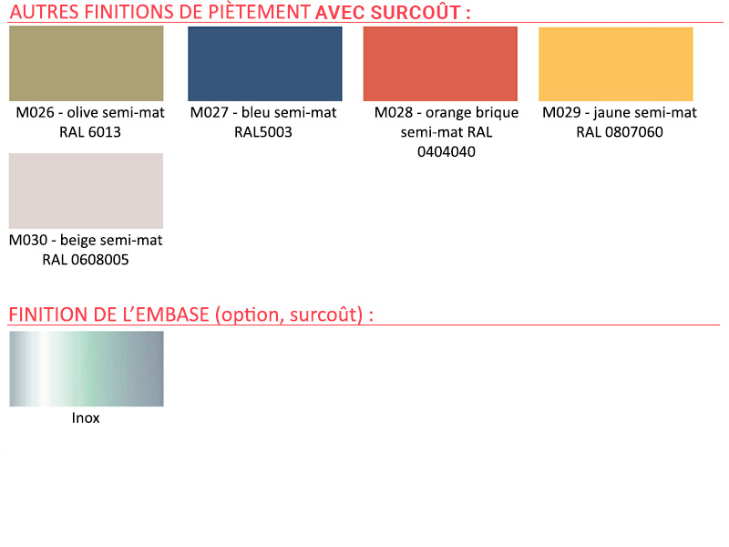 Le piètement est en acier avec une base inoxydable. Il se décline en aluminium RAL9006, blanc semi-mate RAL9010, anthracite semi-mate RAL7043 et noir semi-mate RAL9005.
