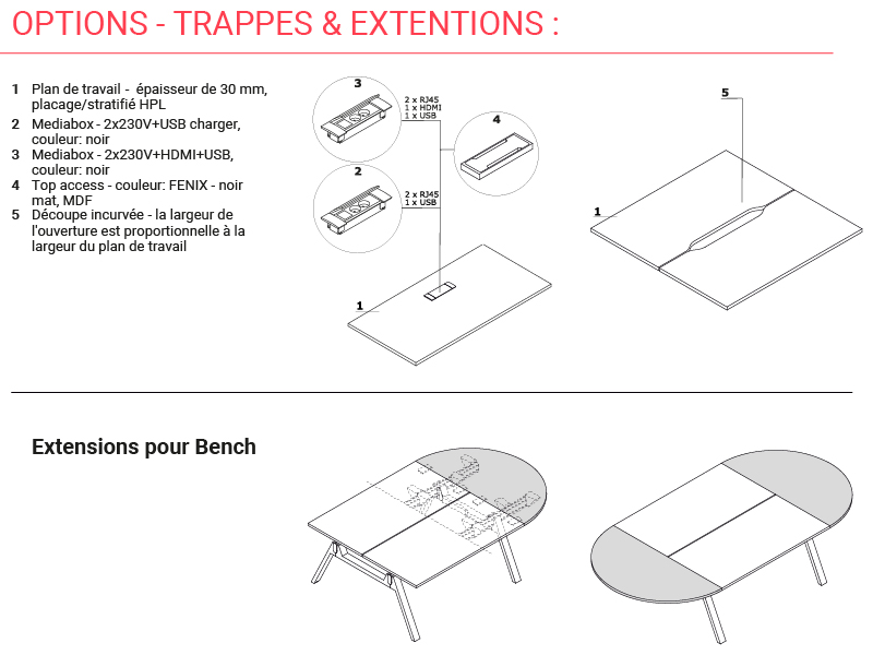La collection Viga offre une variété d’options de gestion des câbles selon la configuration, notamment des découpes passe-câbles, un top access et une Mediabox avec des prises 230V, USB, HDMI et RJ45 selon les options. Le montage est simple et rapide, avec des pieds réglables pour une mise à niveau parfaite. Fabriquée en Pologne, la collection utilise de l’aluminium et des matériaux structurels issus de matières recyclées. Le placage bois est rénovable par ponçage, ce qui prolonge la durée de vie du mobilier.