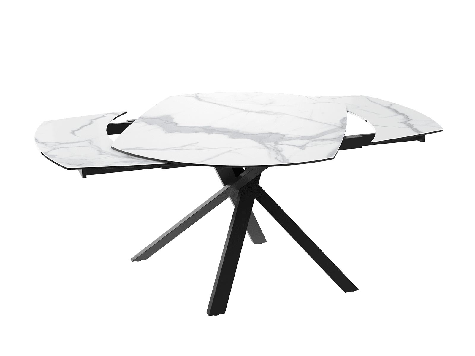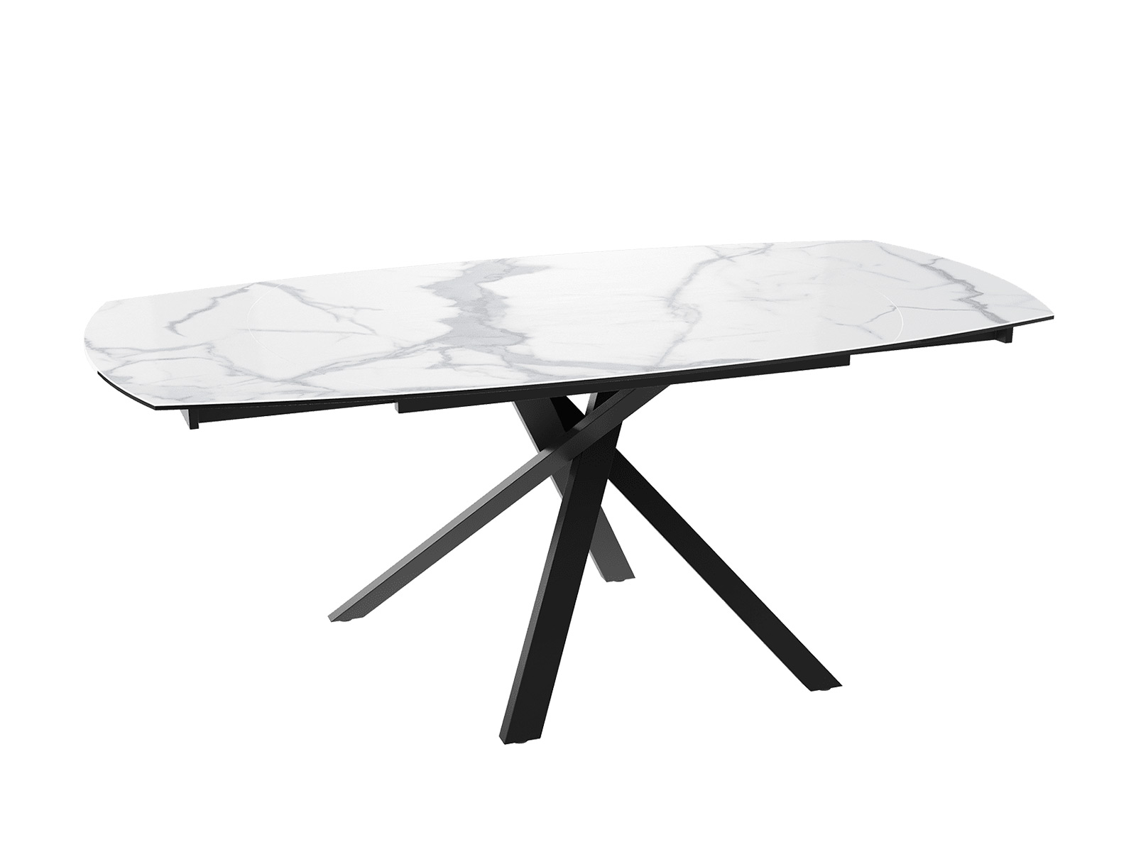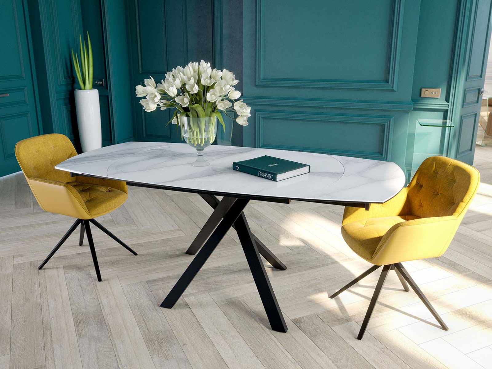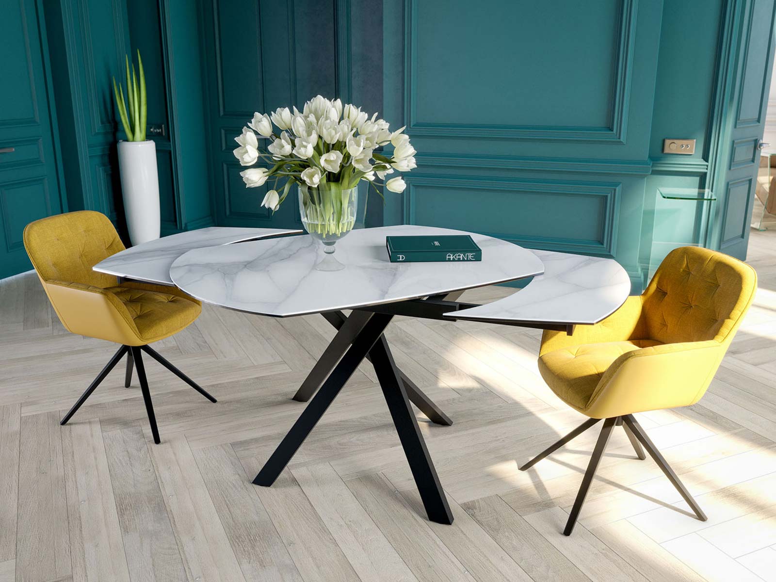 La table est proposée en 2 dimensions : largeur 120/180 cm ou largeur 130/190 cm pour une profondeur de 90 cm et une hauteur de 76 cm. Elle est équipée d'un système synchronisé qui lui permet de s'ouvrir en pivotant sa partie centrale pour laisser sortir les rallonges, le tout en un minimum d'effort.