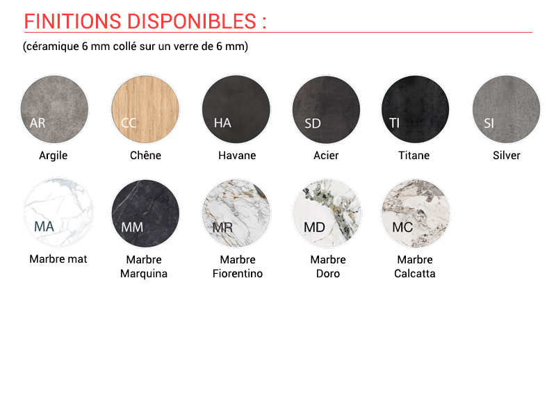 céramique de 6 mm d'épaisseur collée sur un verre de 6 mm. Solide et facile d'entretien, cette surface est disponible dans