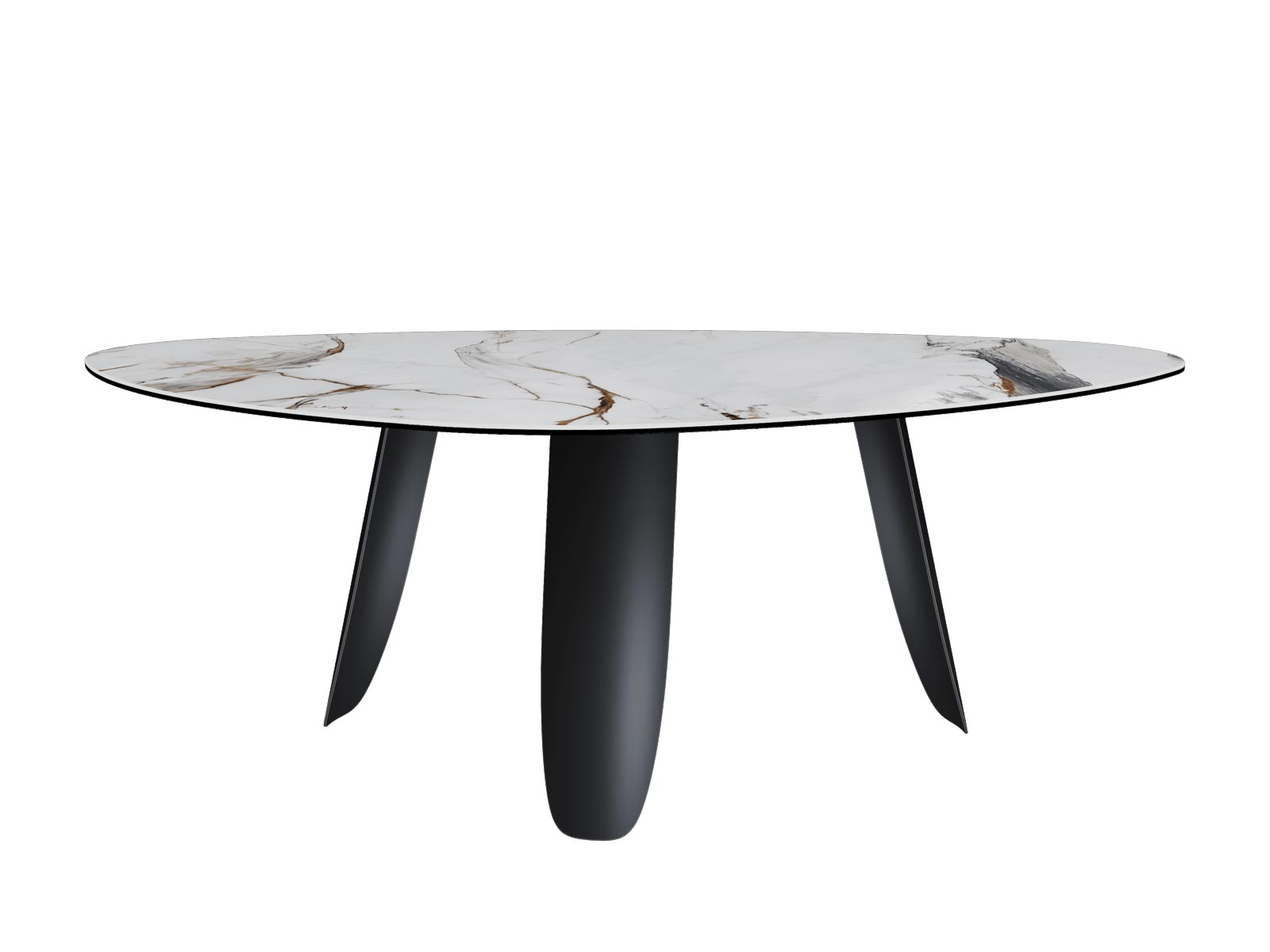 légèreté visuelle et robustesse, assurant une parfaite stabilité sans alourdir l’esthétique globale. La finition de ces deux aciers met en valeur leur contraste avec le plateau brillant, offrant un jeu de textures à la fois subtil et élégant.